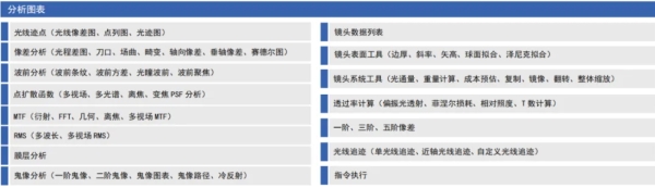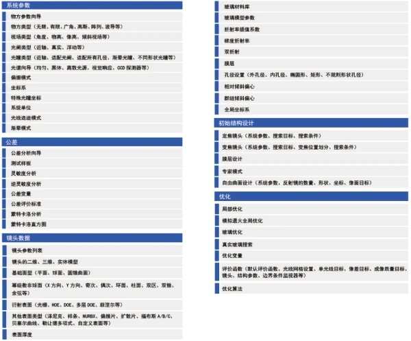 軟件中的工具部件都與設(shè)計(jì)過程中的重要步驟相符合,從而構(gòu)成了軟件中的基礎(chǔ)功能。其中分析、優(yōu)化和公差工具包含了一系列特定公差內(nèi)基于物理算法的分析、仿真、以及優(yōu)化光學(xué)系統(tǒng)。