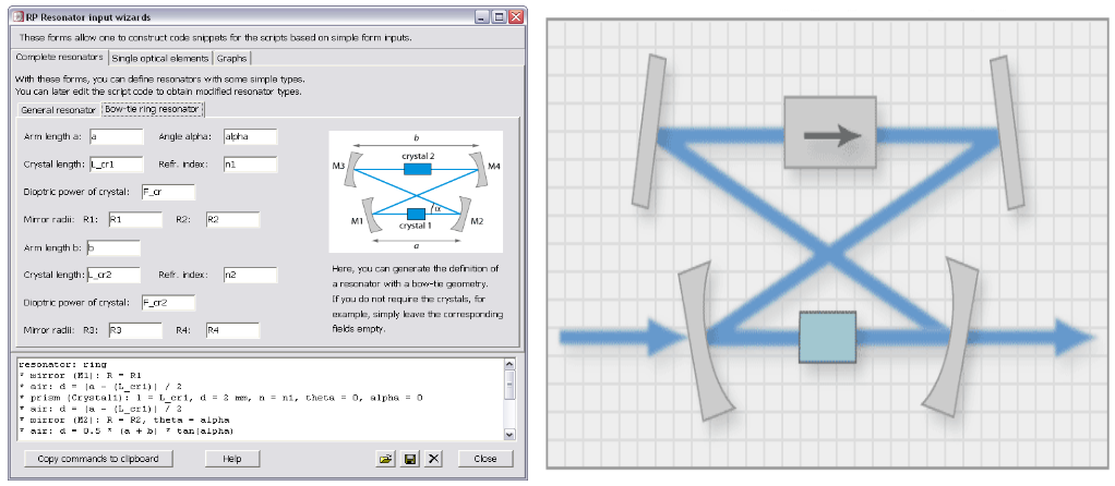 直線(xiàn)腔和環(huán)形腔也可以和從激光諧振腔里輸出的光束一樣被當(dāng)作單程傳播來(lái)處理。對(duì)于環(huán)形腔,光束的路徑可以自動(dòng)閉合,也就是說(shuō),第一個(gè)和最后一個(gè)鏡子的取向及它們之間的路徑長(zhǎng)度可以自動(dòng)計(jì)算。由此產(chǎn)生的設(shè)置可以圖形化地顯示,以立即識(shí)別可能的錯(cuò)誤輸入。