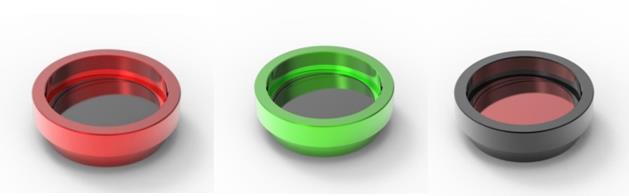 單獨(dú)濾光片有六種版本,OD1濾光片裝在紅色外殼中,可見(jiàn)光透射率為~10%,OD2濾光片裝在綠色外殼中,透射率為~1%, OD3濾光片裝在黑色外殼中,透射率為~0.1%。單獨(dú)濾光片使用了通用C口連接,可以彼此串聯(lián)迭加。在外殼中安裝時(shí),它們有一個(gè)小楔角,以防造成干擾效應(yīng)。