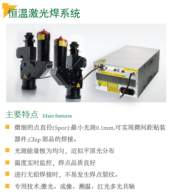 松盛光電激光恒溫錫焊實時溫度反饋系統(tǒng),CCD同軸定位系統(tǒng)以及半導(dǎo)體激光器所構(gòu)成;獨創(chuàng)PID在線溫度調(diào)節(jié)反饋系統(tǒng),能有效的控制恒溫焊錫,有對焊錫對象的溫度進(jìn)行實時高精度控制等特點,確保焊錫良品率與精密度。尤其適用于對于溫度敏感的高精度焊錫加工,如PCB線路板器件/微型揚聲器/馬達(dá)、連接器、攝像頭等等。