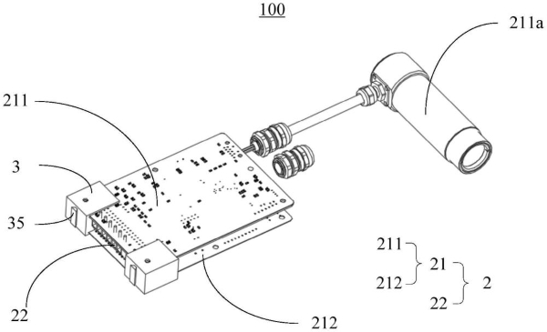 電路板組件:包括多個(gè)沿上下向間隔排布的板體和對(duì)應(yīng)板體間隔設(shè)置的至少一個(gè)雙排針,板體和雙排針位于容置腔內(nèi),各雙排針用以電連接相鄰的各板體。該組件還設(shè)有紅外測(cè)溫模塊和反饋驅(qū)動(dòng)模塊,紅外測(cè)溫模塊的部分設(shè)于一板體處,反饋驅(qū)動(dòng)模塊的部分設(shè)于與之相鄰的另一板體處。