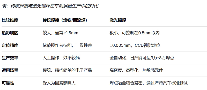 而激光錫焊技術(shù)以其獨(dú)特的局部加熱、非接觸式加工和高精度定位特性,正在成為車載屏顯制造的“精密引擎”。