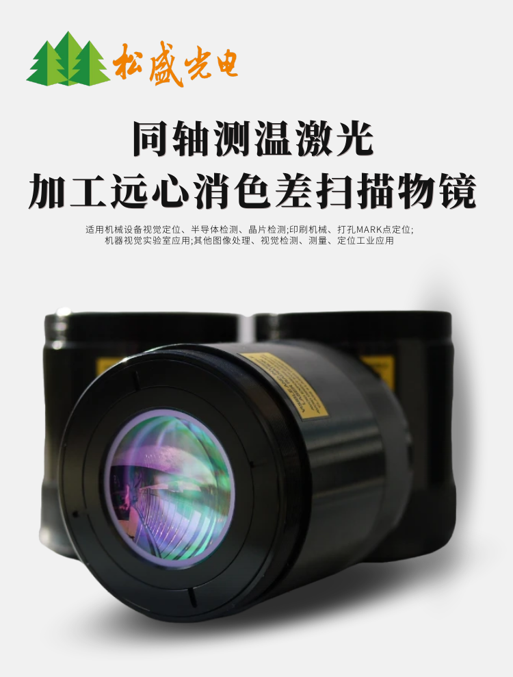 松盛光電針對(duì)機(jī)器視覺激光精密加工需求自主研發(fā)同軸測(cè)溫激光加工遠(yuǎn)心消色差掃描物鏡,該掃描振鏡聚焦系統(tǒng)集成同軸攝像功能,專為滿足有高精度定位要求的振鏡掃描加工系統(tǒng)設(shè)計(jì),CCD觀測(cè)的圖像與激光光束焦點(diǎn)完全同軸,與F-theta鏡頭及照明光源配套可實(shí)現(xiàn)“所見即所得”的機(jī)器視覺定位激光加工。