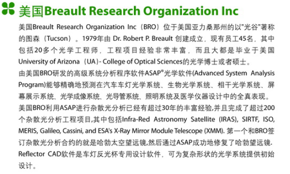 BRO is based in Tuscon, Arizona, and was founded in 1979 by Dr. Robert P. Breault. BRO company has three main business: ASAP software sales and technical support, ASAP education and training and to undertake projects. ASAP software with its powerful features for the US government and the global optical industry has made tremendous service. BRO company to undertake a number of US militaryfighters, warships, chariot LED lighting design and transformation projects. ASAP function of the strong, glimpse.